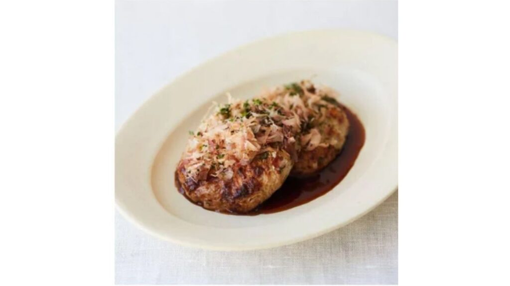 あっさりとした豚ハンバーグに、中濃ソースと青のり、カツオぶしがかかっています。ハンバーグをお好み焼きにみたてたメニューは初体験です…!