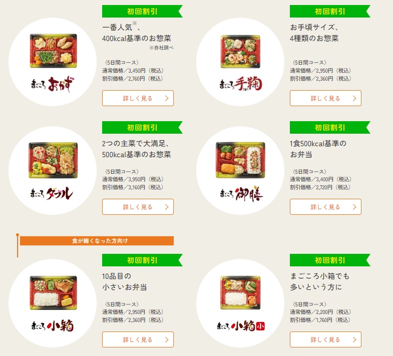 | ライン ナップ | まごころ手鞠 まごころおかず まごころ小箱 まごころ小箱(小) まごころ御膳 まごころダブル | シンプルミール ベジミール ヘルシーミール |