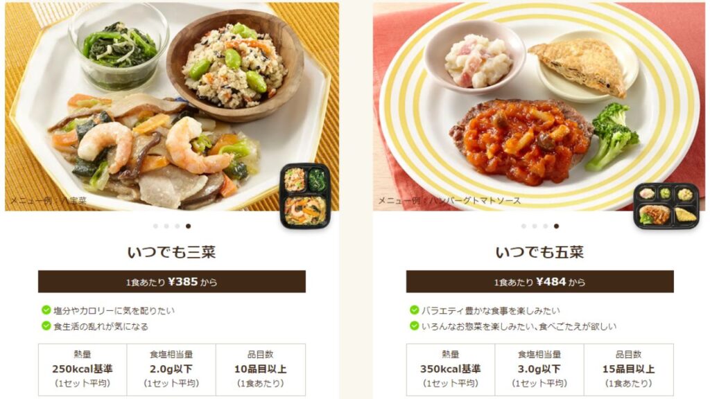 すべて7食セットで、ダイエット食や減塩食など、目的に応じて多くのコースから選べるようになっています。